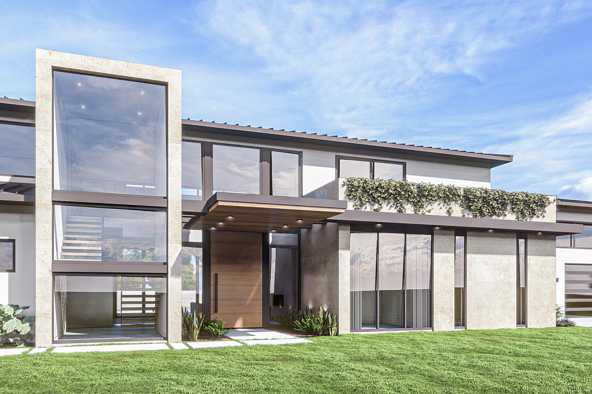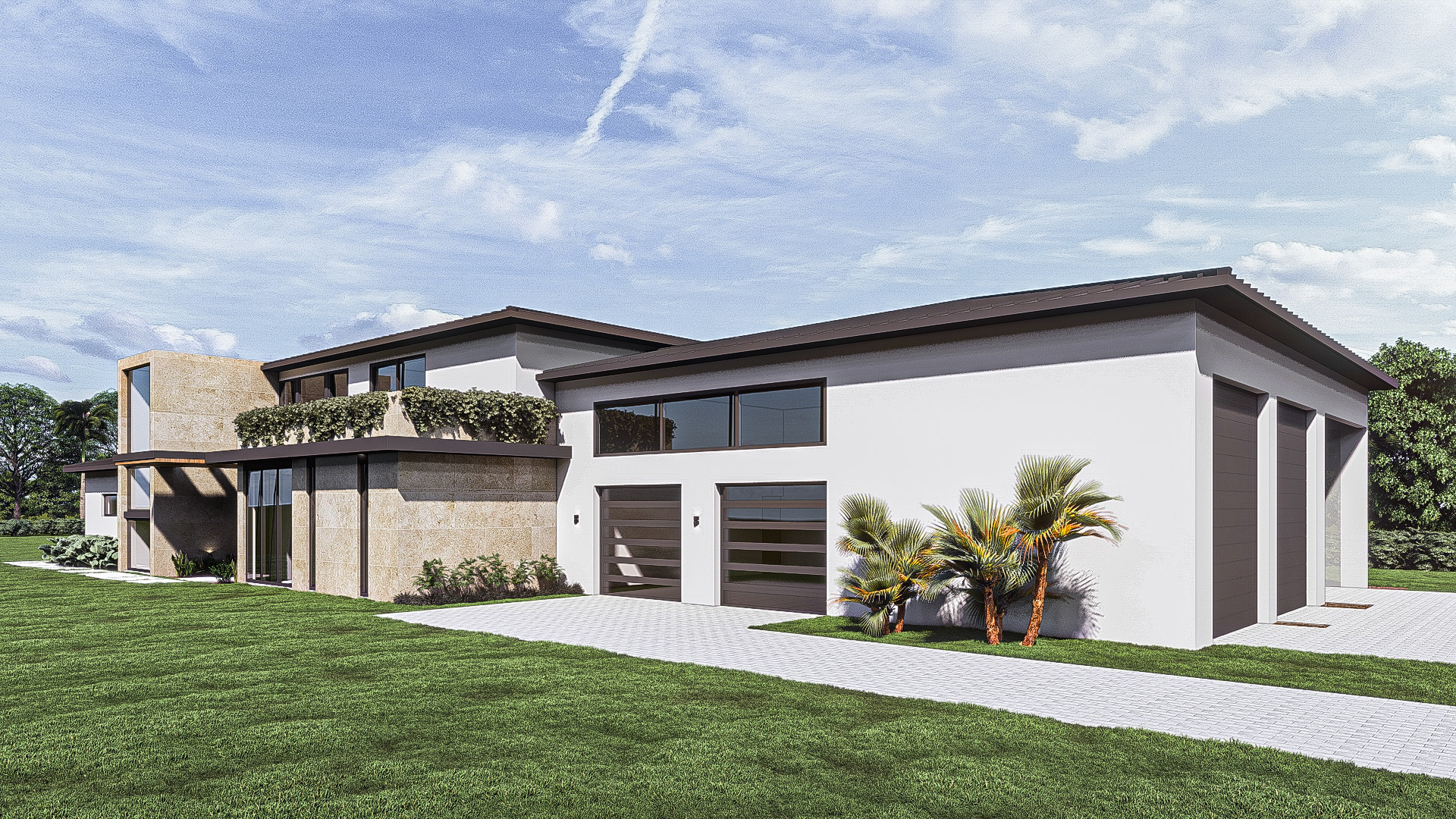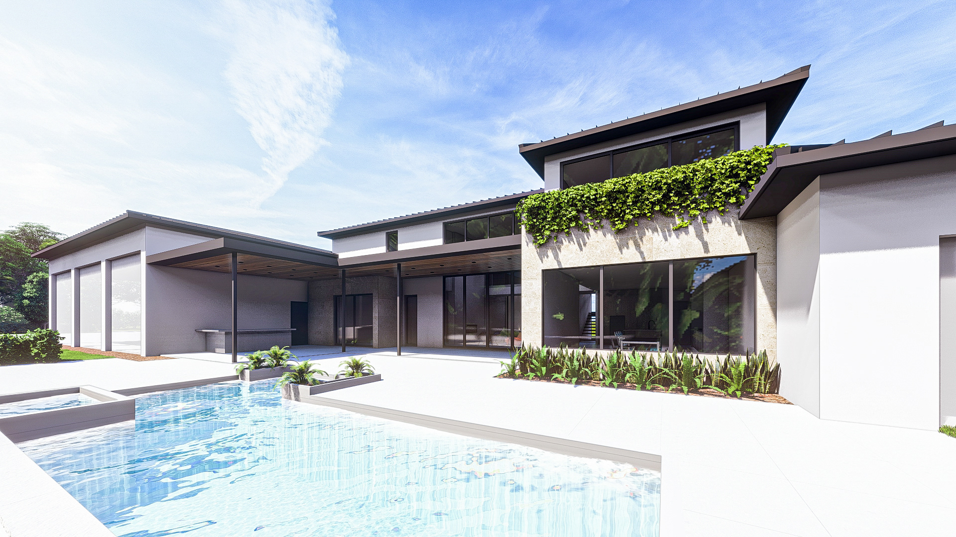 Designed for an RV enthusiast and a lover of the outdoors, this modern take on a farm style single family residence is designed to be meet the needs of both worlds. The design offers RV storage and RV workshop with ample ceiling space and floor area on one side of the house and automobile garage and covered carport on the other. Sandwiched in between is a double height great room and kitchen with maximized glazing looking out over nature and a pool deck.