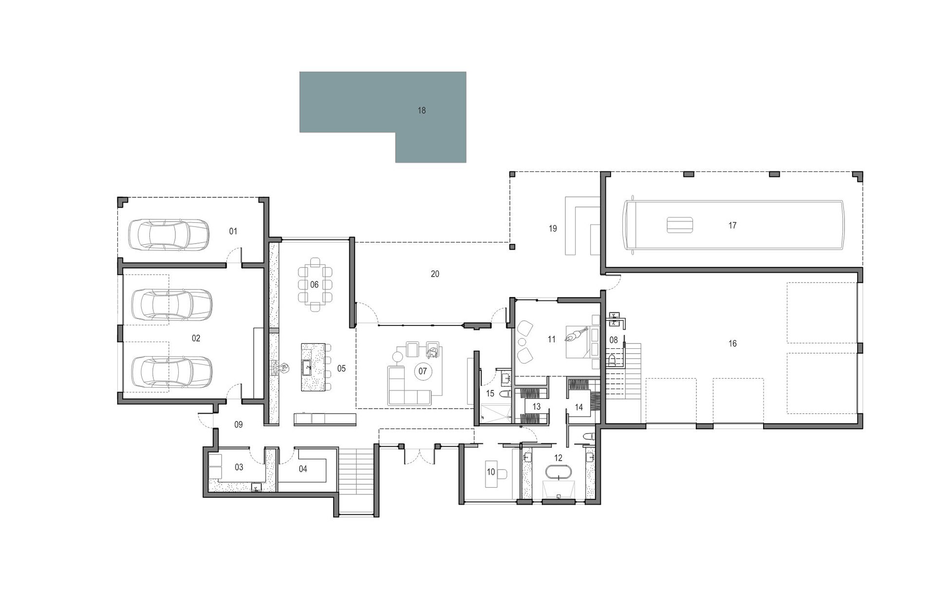 02 Garage 08 Powder room 13 His closet 18 Pool