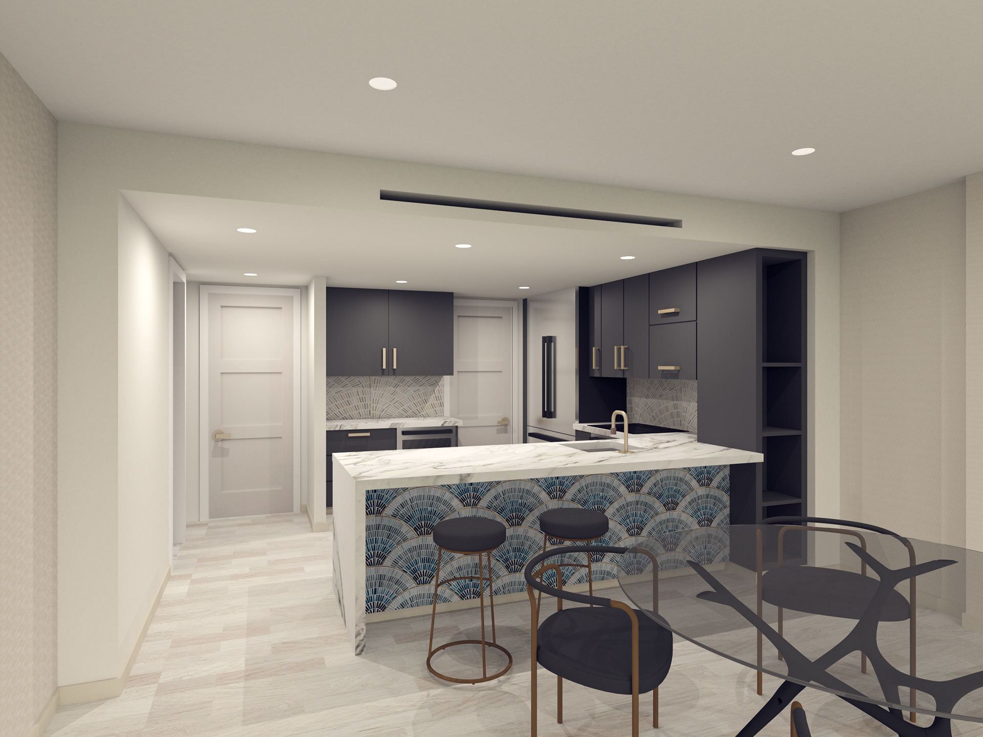 For this interior remodel, our client wished for a more open floor plan that would connect the kitchen to the living spaces. The solution was to remove an existing partition wall and replace the spatial divider with a countertop. In doing so, the floor plan of the unit maintains a distinction between the kitchen and living rooms while allowing natural light and unobstructed views above waist height. This allows for conversations to continue regardless of where you are in the space. The countertop even doubles as a bar, drawing an audience in without getting in the way of the people preparing food in the kitchen. We coined this project the "End to End flat based on the concept of transparency and connectivity of these spaces between the entrance of the flat until the balcony on the opposite end.