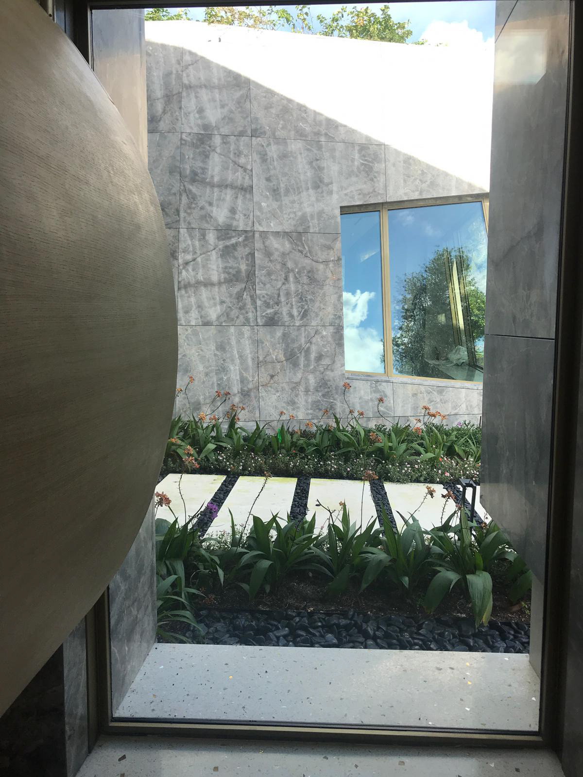 The glazing planned around the mid-landing of the feature stair was coordinated with the builder to be the last glazing to be furnished to allow for the stair to be lifted into the house. A tie beam at the sill of the glazing was also left unfurnished in order for the fork lift to maneuver into the space as seen in the photo above.