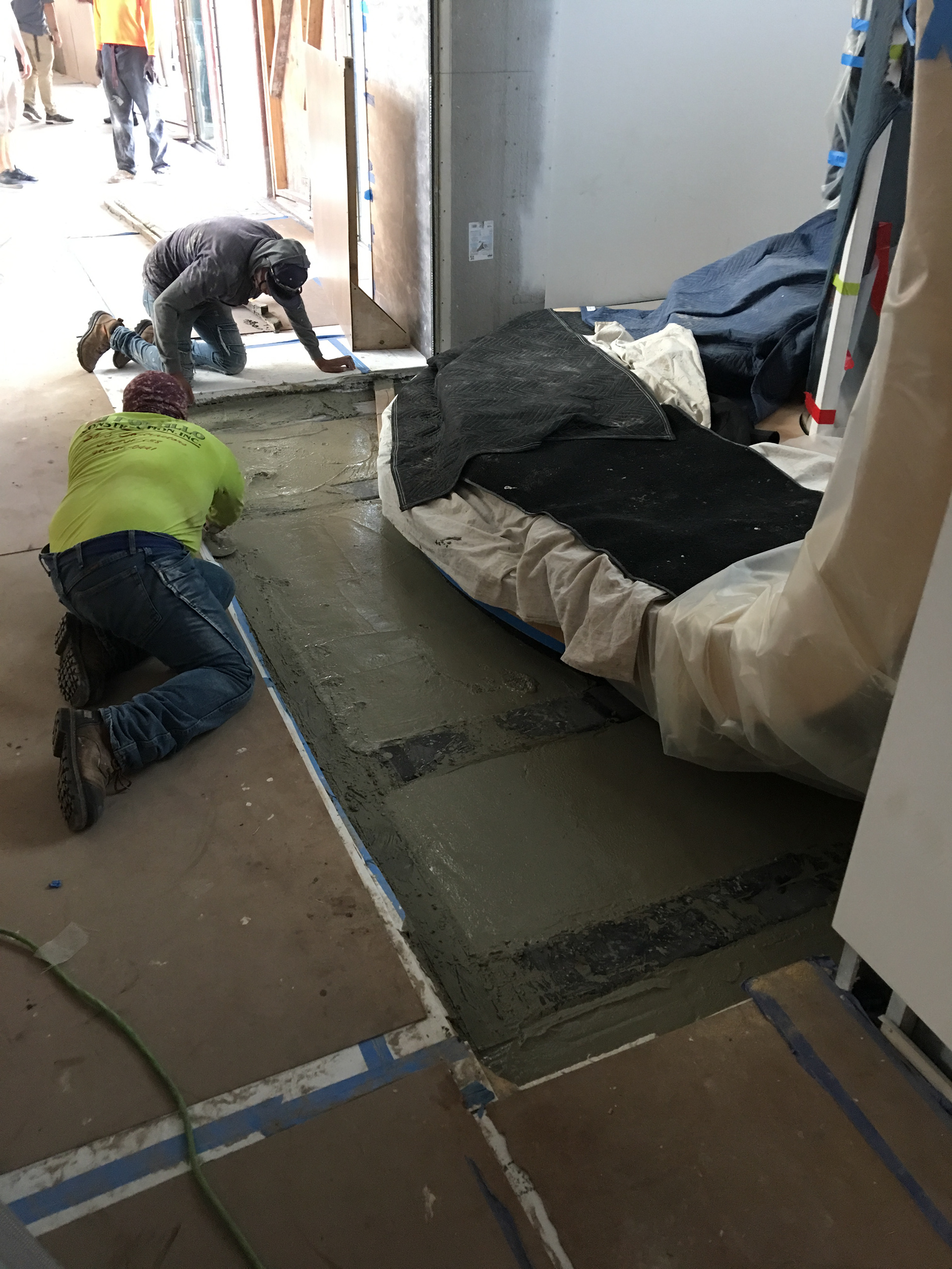 A pit in the slab was specifically designed so that when the skid was lowered down to the ground a flush transition would exist between the top of the skid and the surrounding first level floor. Concrete was subsequently placed within all the voids of the skid to receive the finish floor. It would not have been possible to remove the stair from the skid, early coordination in the design phase, knowledge of transportation methods, and communication between all trades was crucial in the success of the stair.